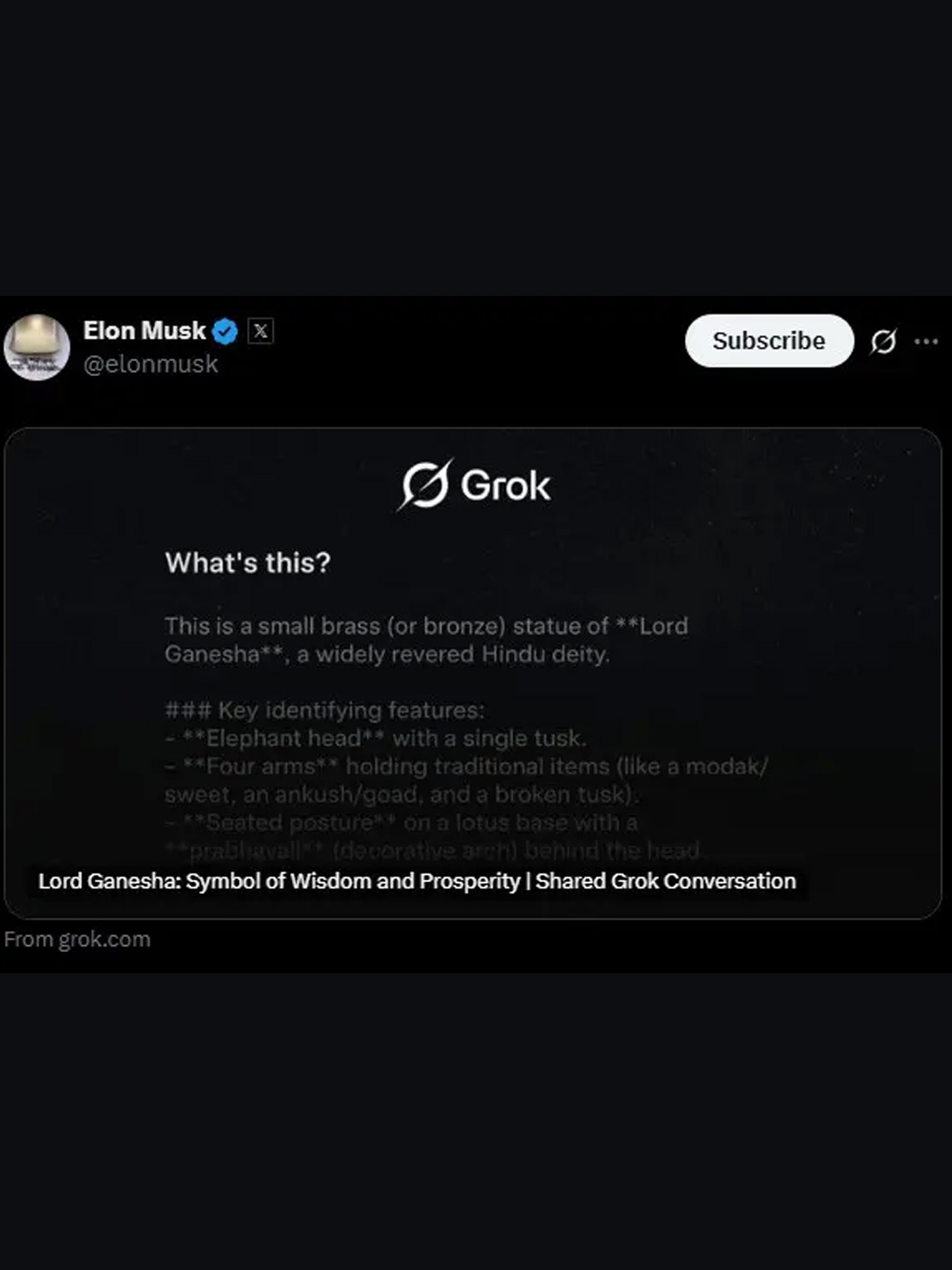 दुनिया के सबसे अमीर इंसान एलन मस्क इंटरनेट पर काफी सक्रिय रहते हैं। उन्होंने X पर  Grok AI का एक लिंक शेयर किया, जो भगवान गणेश से जुड़ा हुआ था।