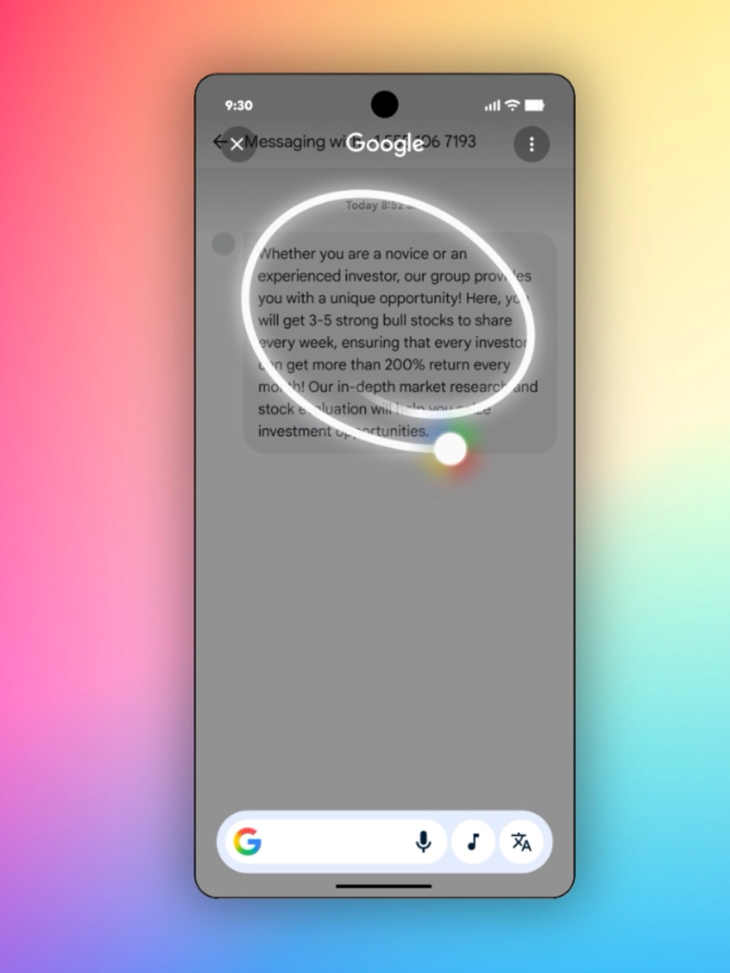 Circle to Search एक्टिव करें, मैसेज को उंगली से घेरें, Google AI तुरंत बताएगा कि मैसेज स्कैम हो सकता है या नहीं।